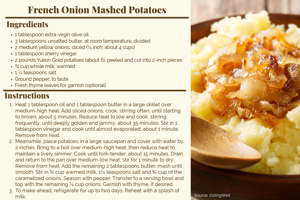 Planning your holiday menu? Here’s a delicious, healthier mashed potato recipe you can make ahead. Topped with savory caramelized onions, the potatoes have plenty of flavor on their own without gravy.
